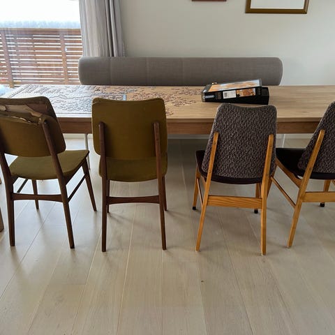 Helt rått spisebord i heltre eik selges. Henning Kjærnulf for EG Møbler, Danmark. Bordet blir langt med alle tre platene i, over 3 meter. Ekstra støtteben på midten.