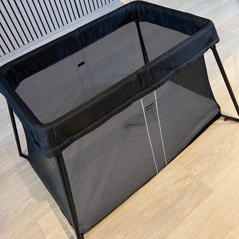 Babybjörn reiseseng for barn. Sammenleggbar modell i mørk farge med netting på sidene for innsyn og lufting. Sengen har en madrass som legges i bunnen, og leveres med bæreveske med håndtak for enkel transport og oppbevaring. Egnet som ekstra seng på reise eller hos familie og venner.