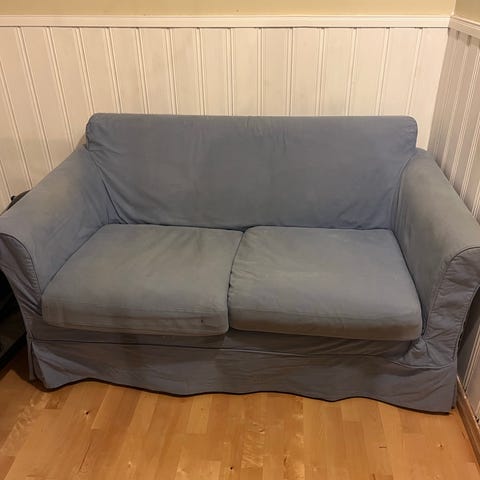 Sofagruppe 3 seter og 2 seter selges billig. Det følger med beige setetrekk som er enkel å bytte til. Disse trekkene framstår fine og ikke synlig brukt som de blå trekkene som sitter på pr. nå. Sofaen har stått lenge ubrukt så kommer seg nok med en vask. Trekkene kan vaskes i maskin. Selges samlet.