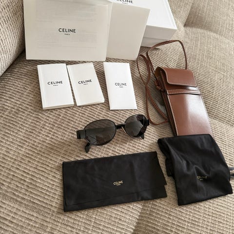 Solbrillene har metallinnfatning med Celine-logo på stengene og mørke glass. Formen er geometrisk/lett kantet. På bildene følger det med et brunt etui/veske med Celine-logo samt eske og tilhørende kort. Passer til unisex-bruk.