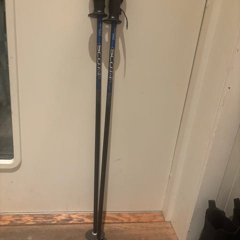 ZOOZ skistaver i blå farge med hvite håndtak og stropper. Stavene har ergonomisk formede plastgrep og trinser nederst mangler. Egner seg til bruk i alpinbakke eller til generell skiaktivitet, avhengig av lengde og brukerens behov.