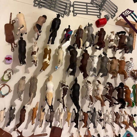 Schleich lekesett hestegård med flere hestefigurer, rytterfigurer og tilbehør. Settet inneholder blant annet stallbygning, gjerder, ulike hester i forskjellige farger og størrelser, samt flere smådyr. I tillegg følger det med bøtter, fór, kasser, redskaper og annet stallutstyr som kan brukes til å lage en hestegård eller stallscene. Alle deler er typiske Schleich-figurer i plast med detaljert utforming, egnet som lekefigurer eller samlerfigurer for barn som liker hester og gårdsliv.