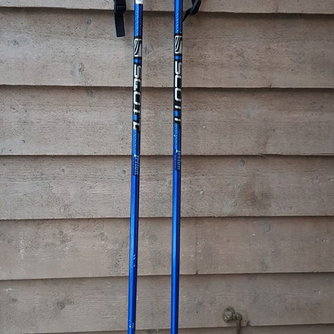 Leki alpinstaver i metall med blå øvre del og sølvfarget nedre del. Stavene har ergonomiske håndtak i svart plast/gummi og små trinser med metallspiss. Egnet til bruk i alpinbakke. Lengde fremgår av målestokken på bildene og kan eventuelt etterspørres hos selger.