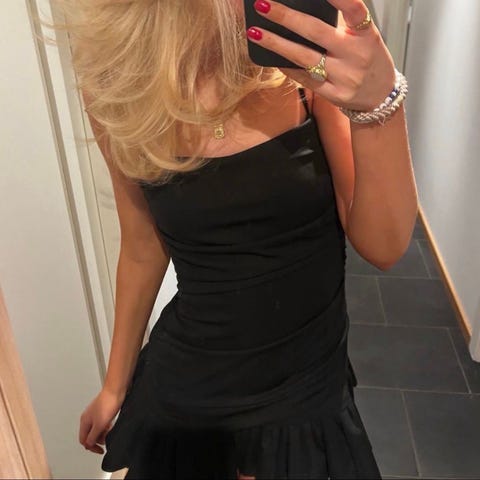 Zara kjole i størrelse S. Laget i polyester/rayon/elastan. Modellen er figurnær med knelengde og har et dekorativt metallspenne i midjen foran samt strikkfelt bak i livet for bedre passform. Splitt nederst på skjørtet gir mer bevegelsesrom. Enkel, ermeløs modell som passer til formelle anledninger og festbruk.