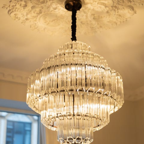 Lysekronen måler 87 cm i høyden og 80 cm i diameter/ bredden og lengden. Den har bronze ramme og håndlaget cognac farget glass.