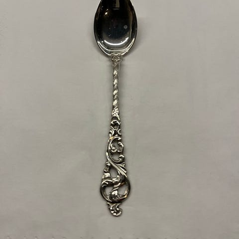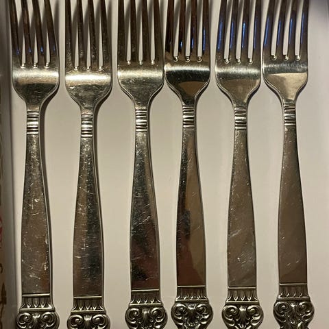 11 stk teskjeer,ca 11.5 cm og 1 stk sitrongaffel,i flott brodert oppbevaring. Dobbel rokokko!