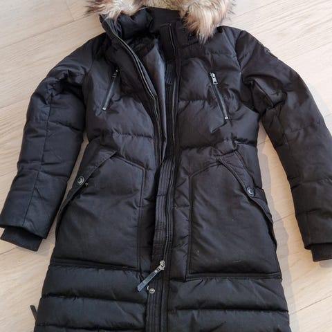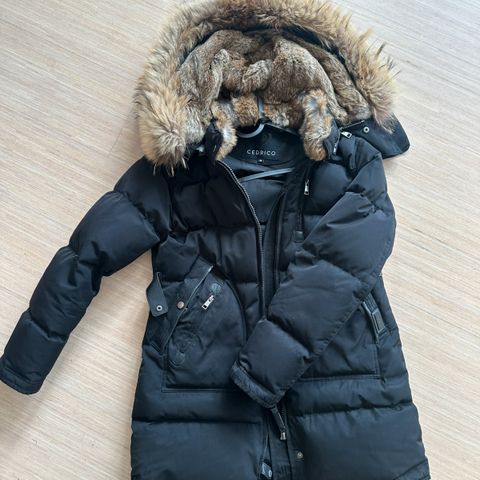 Cedrico dunjakke for dame i størrelse S. Jakken er brun og fylt med dun. Den har hette med pelskant, glidelåslukking foran og flere utvendige lommer med glidelås. Lengden går ned over hoftene for ekstra dekning. Passer som ytterjakke i kjøligere vær.