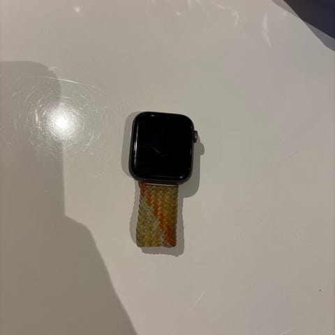 Apple Watch smartklokke med rektangulær skjerm og rosa silikonreim. Klokken har digital skjerm og berøringsfunksjon. Medfølgende magnetisk ladekabel med USB-tilkobling. Egnet til daglig bruk, aktivitetssporing og varsler når den er paret med kompatibel iPhone.