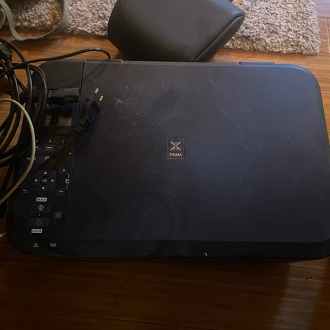 Canon Pixma multifunksjonsskriver i svart. Enheten har flatbed-skanner på toppen og kontrollpanel med display og knapper på fronten. Skriveren leveres med strømledning, blekkpatroner, brukerveiledning og installasjons-CD slik det vises på bildene. Egnet for utskrift, skanning og kopiering av dokumenter og bilder hjemme eller på kontor.
