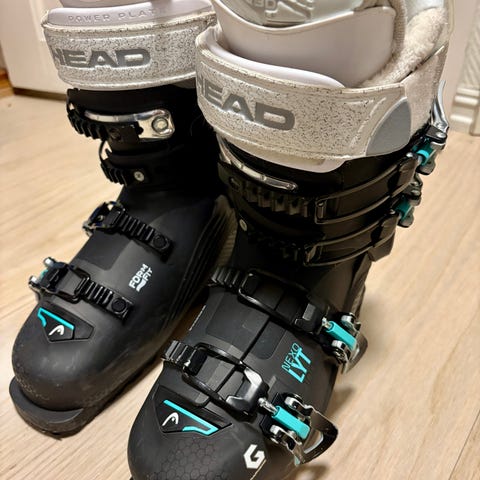 Head ski støvler i størrelse 24.0–24.5. Modellen har fire justerbare spenner og powerstrap øverst for bedre tilpasning rundt leggen. Støvlene er i hovedsak svarte med lyse detaljer.