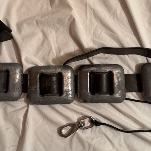 Det følger med 4 blyplater, men vesten har totalt plass til 8 blyplater på 600 gram (6 i ryggen og 2 i hoftebeltet). Blybeltet tas på etter vesten, og plasseres nedenfor vesten, men over den hvite kulen.