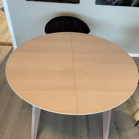 Spisebord Casø fra A-møbler 130 cm diameter + 4 stk Nora stoler fra Skeidar selges.