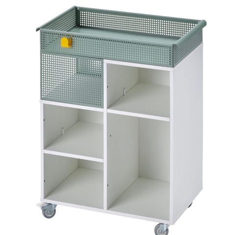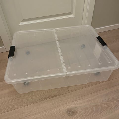 En bedroller med delt lokk og hjul, mangler det ene hjulet. str. 58 x 74 cm, høyde 16 cm.