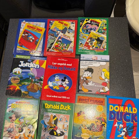 Disney Donald Duck barnebøker samling. Pakke med flere små bildebøker med historier om Donald Duck og andre kjente figurer fra Andeby. Bøkene er i lommebokformat med illustrerte omslag og innhold tilpasset barn. Egner seg som høytlesning eller egenlesning for barn som liker Disney og Donald Duck-fortellinger.