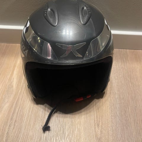 Carrera CR Super G ski- og snowboardhjelm i størrelse M (57–58 cm). Hjelmen er helhjelmtype med ørebeskyttelse og ventilasjonsåpninger i sidene. Justerbar hakestropp med klipslås. Farge grå med sølvfargede detaljer. Egnet til alpint og snowboardbruk.