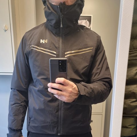 Helly Hansen jakke for herre i størrelse M, men som fint passer L ettersom den er laget for expeditioner og hardt vær og derav noe større i størrelsen for plass til flere underlag.
