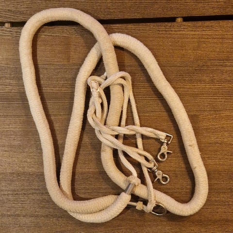 Sett med diverse hesteutstyr for kjøring. Inneholder blant annet longeringsliner/tøyler, gjord, hodelag, longeringshodelag, eksemdekken og et par sporer i plastpose. Nøyaktig innhold og størrelser fremgår av bildene.