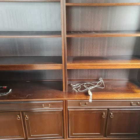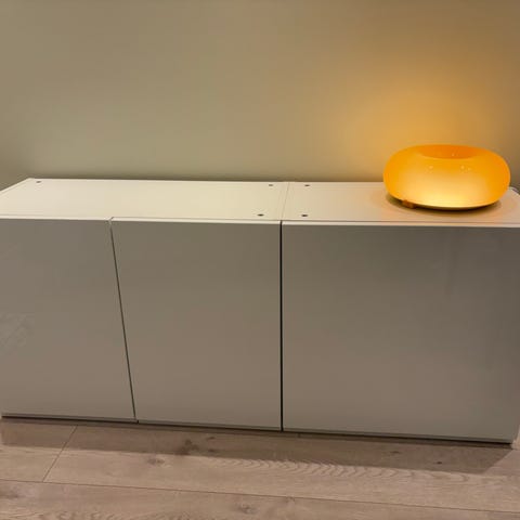 Fire Sigdal skap med dører (til tre av skapene) gis bort. På bildene står skapet på hodet med føtter øverst. Det er noen merker på skapene. Skader på innsiden av det ene skapet ved dørhengsler.