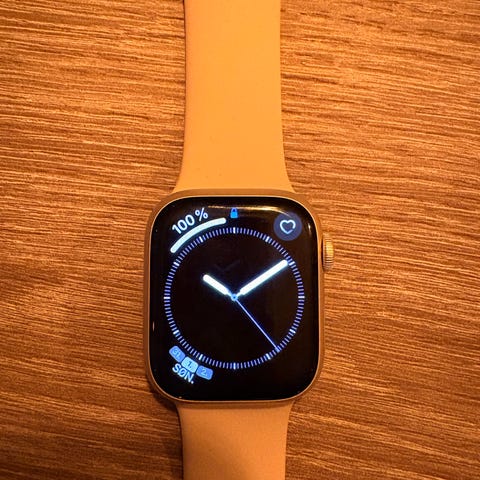 Apple Watch smartklokke med svart urkasse og svart lenke i metall. Rektangulær berøringsskjerm med digital krone på siden. Viser varsler, tid, vær og apper på skjermen. Klokken har optisk sensor på baksiden for måling av aktivitet og puls. Leveres med justerbar lenke som kan tilpasses håndleddet.
