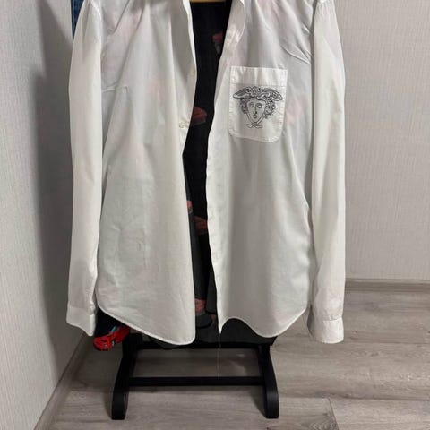 Versace Palazzo Fit skjorte for herre i størrelse M. Skjorten er svart med rødt bilmotiv og er laget av bomull. Modellen har klassisk krage, knappelukking foran og lange ermer. Passformen er merket som Palazzo Fit. Egner seg til hverdagsbruk eller mer oppkledde anledninger der man ønsker et mønstret plagg med tydelig uttrykk.