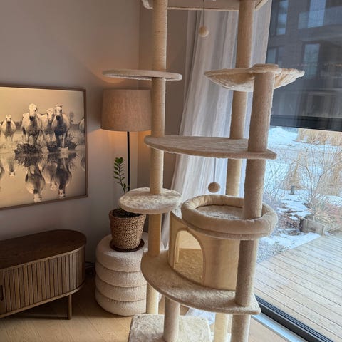 Klatrestativ for katt i beige tekstil med flere nivåer og liggeplasser. Stativet har flere plattformer i ulike høyder, en rund liggeskål øverst, en halvsirkelformet liggeflate, en firkantet plattform samt en rund liggedel nederst. Det er også en liggetunnel nederst på stativet. Egnet for innebruk til lek, klatring og hvile for katt.