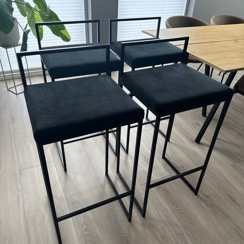 Helt nye, aldri brukt. Skrudd opp for å selge. Selges fordi jeg river barløsningen på kjøkkenet. Ny pris pr stol 1200,-. Selges samlet for 4000,-