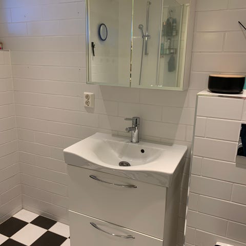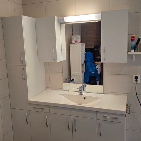 Baderomsinnredning med servantskap og speilskap i hvit.