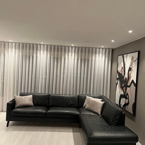 Sofaen har vært i daglig bruk, men er godt vedlikeholdt. Sofaen i mørk blå velourstoff. Trekk kan tas av, sofaen tåler rens og er sist renset august -25. Veldig lett å tørke av, holde ren. Kan deles opp i to moduler for enklere frakt