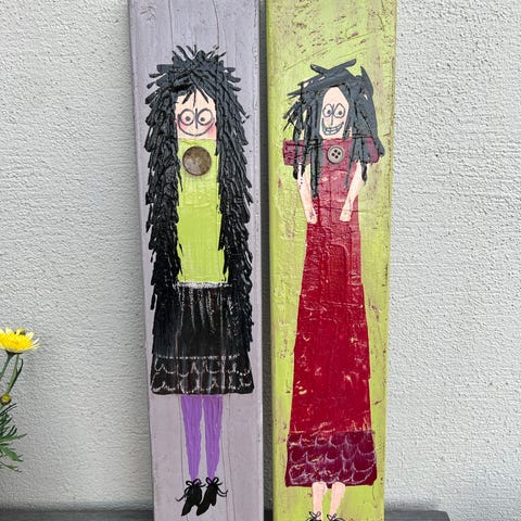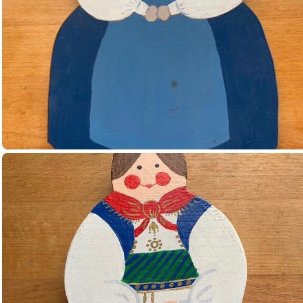 To søte originale hustavler av 70-talls plakat/dekorkunstneren «Bitte»(Kjerlighet er…), olje på treplate. En med garderobemotiv og en med kjøkkenmotiv. B: 13,5, H: 69