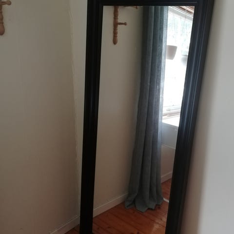 Stort speil med sort ramme.