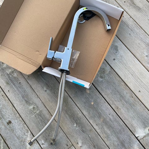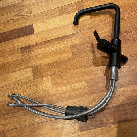 Ettgreps kjøkkenkran med høy, L-formet tut. Overflaten er i blank krom. Kranen har sideplassert hendel for regulering av vannmengde og temperatur. Leveres med tilkoblingsslanger og festeanordning for montering i benk eller vask. Passer til standard kjøkkenvask-/benkeplatemontasje der det er hull for ett hulls armatur.
