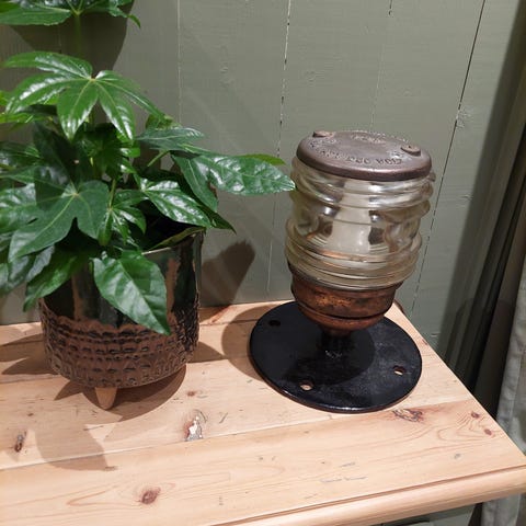 Vintage bordlampe i maritim / industriell stil med kraftig metallkropp og ovale glassfelt i varmt ravfarget glass. Lampen gir et behagelig, stemningsfullt lys og har et tydelig nautisk uttrykk inspirert av eldre skips- og lanternedesign, med myke, organiske linjer som gir et svakt Jugendstil-preg i formen. Solid og tung konstruksjon, laget som lukket elektrisk lampe fra fabrikk (ikke ombygget). Ventspalter er del av designet. Fungerer som den skal. Passer godt i klassisk, industrielt, maritimt eller retro interiør. Normal aldersrelatert patina.