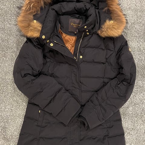 Vannucci Limited dunjakke for dame i størrelse 36. Jakken er beige og fylt med dun, 80/20 dun/fjær, noe som gir god isolasjon. Modellen har hette med avtagbar pelskant, glidelåslukking foran og horisontale vatterte sømmer. Ytterstoffet er vannavvisende, se merkelappen fra produsent. Passer som ytterjakke i kaldt vær. Fôr og detaljer kommer i en kontrastfarge på innsiden. Designet for kvinner.
