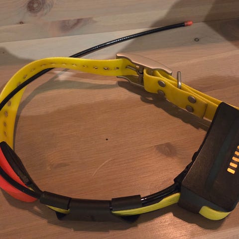 Garmin hundepeiler med håndholdt enhet og tilhørende hundehalsbånd.