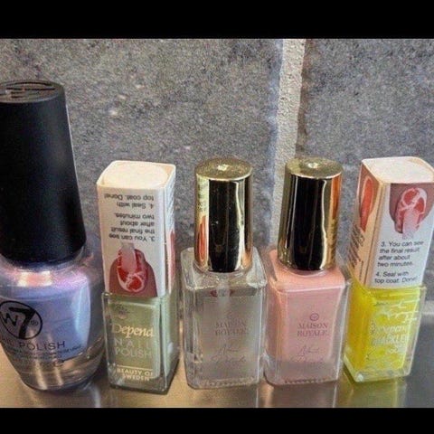 Sett med flere neglelakker i blandede farger. Inneholder blant annet blå, rosa og transparente nyanser. Passer til vanlig bruk på negler. Flaskene har ulike størrelser og typer applikator, egnet for enkel påføring hjemme.