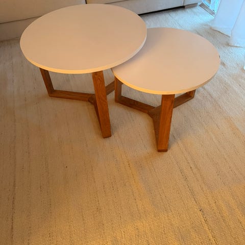 IKEA nattbord i tre med rund bordplate. Bordene har to nivåer med oppbevaringshylle under og en lys treoverflate. Egnet som nattbord ved seng eller som små sidebord i stue eller gang. Pris 300,- pr bord