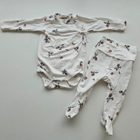 🔍 Søkeord: babyklær, body, bukse, bukser, str 68, str 74, 6 mnd, 9 mnd, MarMar Copenhagen, Tiny Treasure, økologisk bomull, babytøy, mønstret body, svart bukse, babysett, pent brukt, jente, gutt, unisex