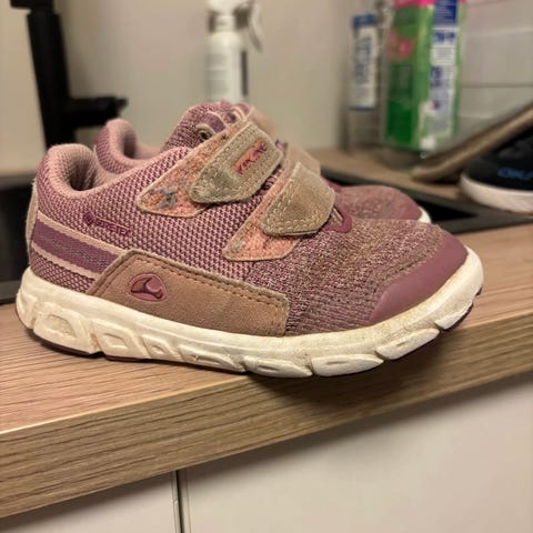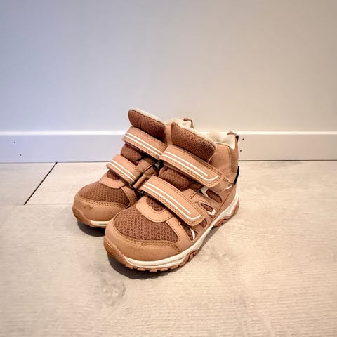 Viking goretexsko i størrelse 25. Skoene har overdel i tekstil med forsterkninger, og lukkes med tre borrelåser over vristen for enkel justering. Sålen er mønstret gummi som gir godt grep. Fargen er rosa. Egnet som hverdagssko til barn.