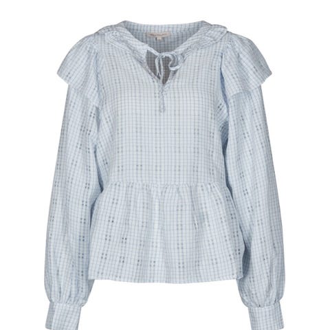 Neo Noir Alberta Flower bluse i størrelse 34 for dame. Blusen er i lys blå farge med brodert blomsterdetalj. Den har lange ermer, rund hals og rynket/smocket parti i front og midje som gir en lett utsvinget kant nederst. Materiale: 100 % bomull.