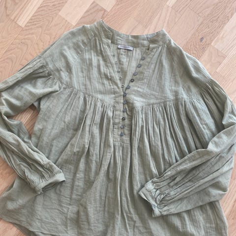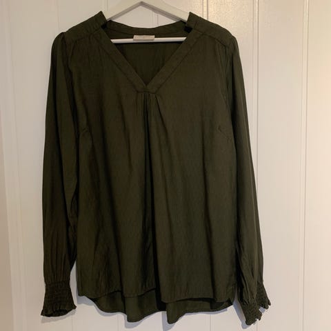 H&M bluse for dame i størrelse S. Blusen er grønn og laget av 100 % bomull. Den har lange ermer med mansjetter og knapp, samt V-utringning uten krage. Stoffet har en lett struktur som gir et uformelt preg. Passer til hverdagsbruk og kan kombineres med både bukser og skjørt.