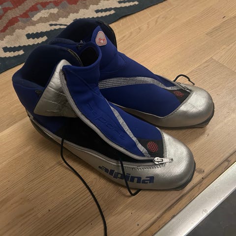 Alpina langrennsstøvler i størrelse 47. Støvlene har overdel i syntetisk materiale med svart og sølvfarget design.