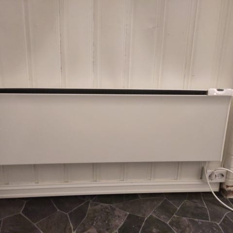Hvit veggmontert panelovn fra Adax, ikke smart. Ovnen er rektangulær og lav, egnet for montering under vindu eller langs vegg. Den har integrert betjeningspanel på siden med knapper for innstillinger. Pen. Må hentes.