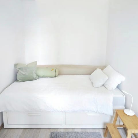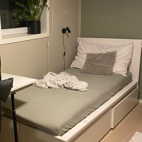IKEA slakt seng med uttrekk og skuffer i hvit utførelse. Sengen kan brukes som enkeltseng til daglig og trekkes ut til dobbeltseng ved behov. Under sengen er det integrerte skuffer som gir ekstra oppbevaringsplass, for eksempel til sengetøy eller puter. Passer godt i gjesterom, barnerom eller mindre soverom der det er behov for fleksibel sengeplass og lagring.