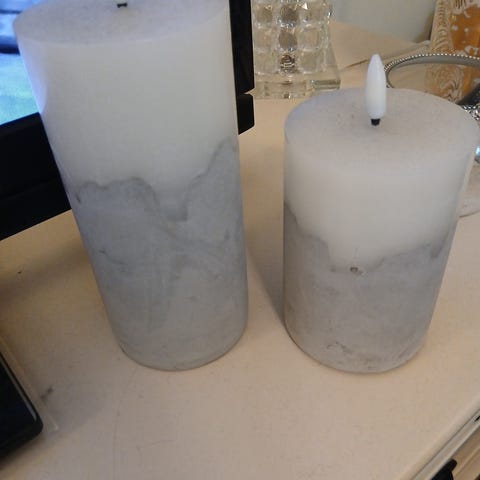 Lyser i rosa/lilla farge.