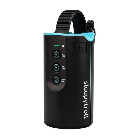 Sleepytroll vognvugger i svart farge. Enheten festes til barnevogn med integrert stropp og gir automatisk vugging.