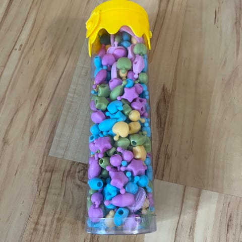 Selger 10 badeleker i form av små baller, med tall fra 0 til 9.