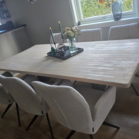 Gammelt spisebord med to innleggsplater på 50cm hver. Funker som det skal. Trenger kjærlighet på toppflaten, men en duk gjør susen.