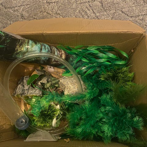 Dekorstein i brun farge med naturlig hullform i midten. Steinen har en ujevn, porøs overflate og organisk form. Størrelsen kan anslås ut fra sammenligning med fyrstikkeske på bildene. Egner seg som dekorasjon, for eksempel i hylle, på bord eller som element i plante- eller akvarieoppsett der materialet er egnet.