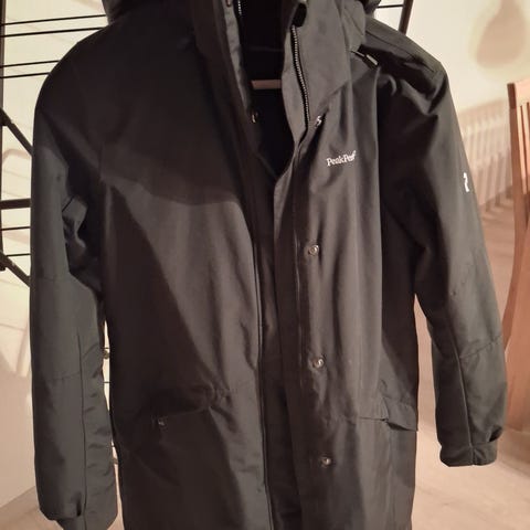 Lang ytterjakke i nylon med hette, glidelås og knapper. Gode lommer. Teddyfor innvendig samt boblestoff. Litt oversize. Røde snorer.