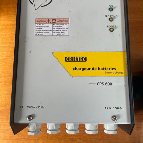 Batteriladeren er en 230 V enhet beregnet for lading av 12 V batterier. Den har kjøleribber i metallhus og innebygd vifte for kjøling. På tilkoblingssiden finnes skruterminaler for batterikabler, strømtilkobling med kabel og bryter for av/på. Enheten har også tilkoblinger for styring/overvåking etter behov.